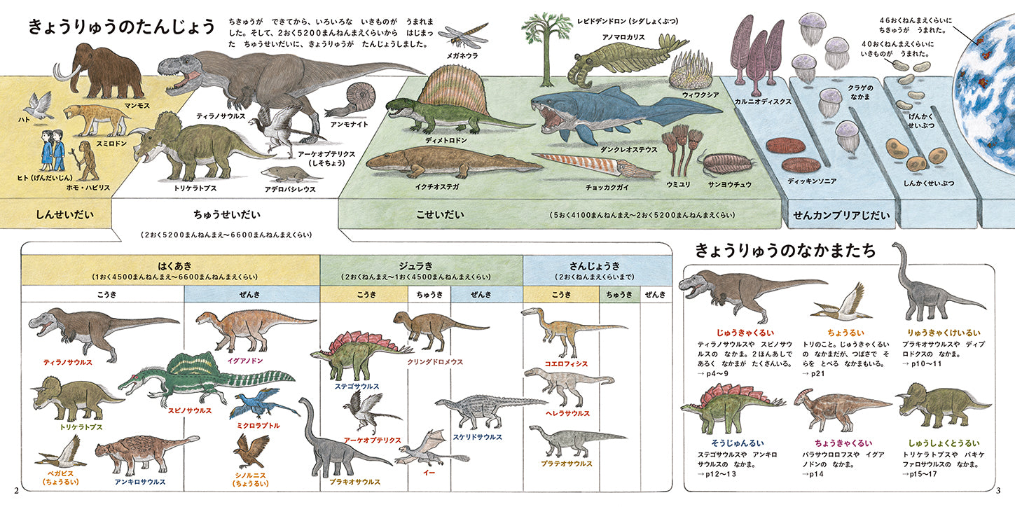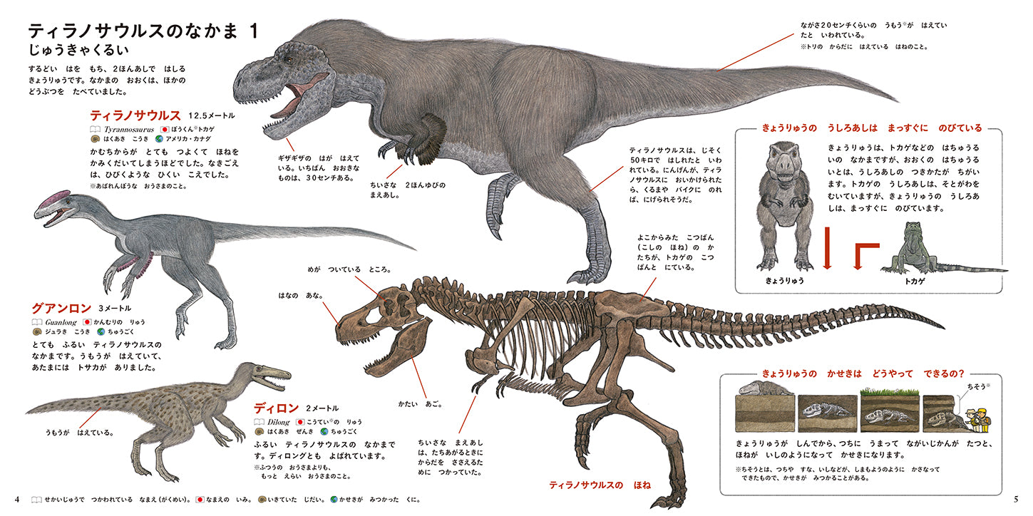 恐竜56種と同時代の動物16種を、最新の学説に基づいてリアルに描いた図鑑絵本。羽毛の質感まで丁寧に表現され、見て知って考える楽しさが詰まっています。