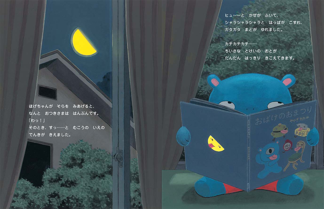 ある夜、ほげちゃんの部屋に「おばけ」があらわれます。こわがるほげちゃんとは反対に、おばけは遊びたくてしかたがない様子。