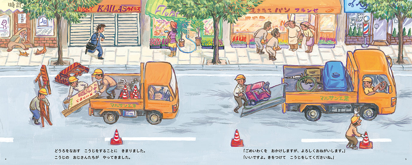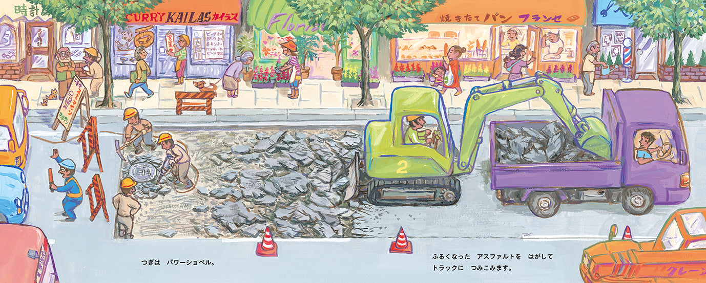 街づくりの仕事を、淡々と、しかし温かい視線で描いた一冊。乗り物好きの子にも、はたらく人を見るのが好きな子にもぴったりです。
