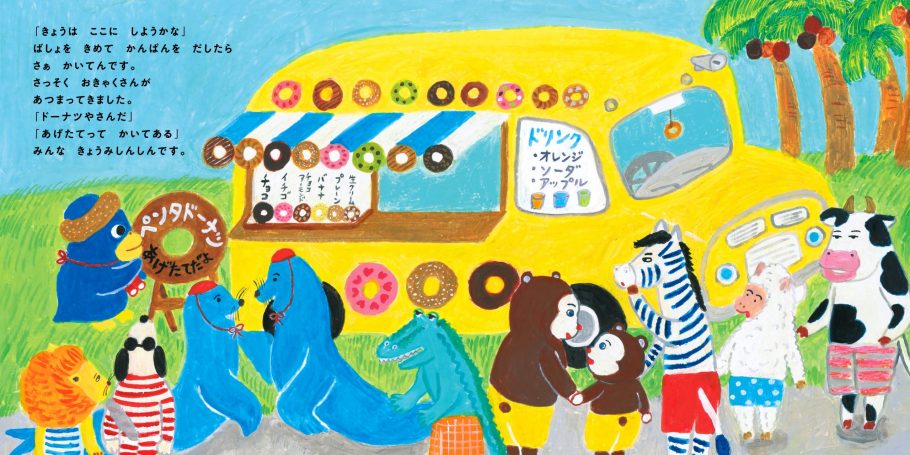 ペンギンのペンタくんは移動販売のドーナツ屋さん。頭にかぶったドーナツはトレードマーク。お店に集まるお客さんの「ぼくの顔のドーナツを作ってよ!」という注文に、ペンタくんは大奮闘します。ところが、そこで大事件が……!
