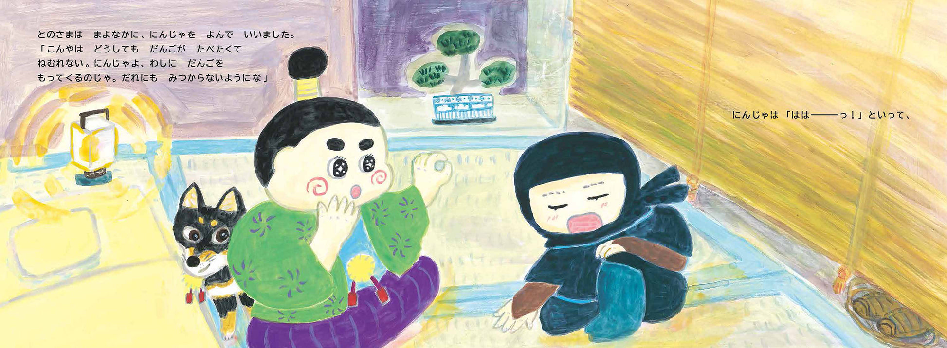 真夜中におだんごが食べたくなったおとのさまが、忍者に伝言をたのむと「だんご」が「りんご」に…伝言ゲームのように変わっていくユーモア絵本。言葉遊びと意外な展開で子どもが夢中になります。