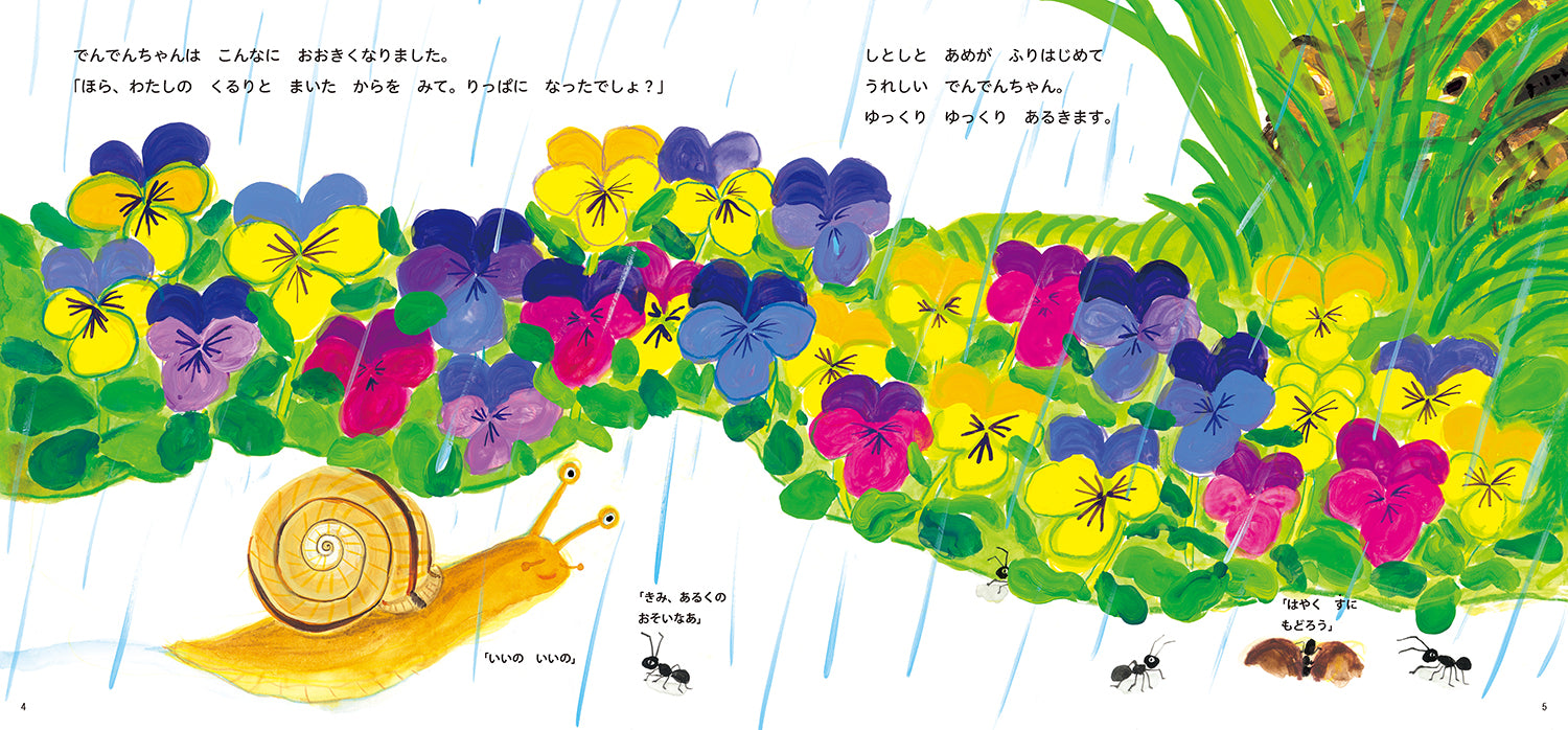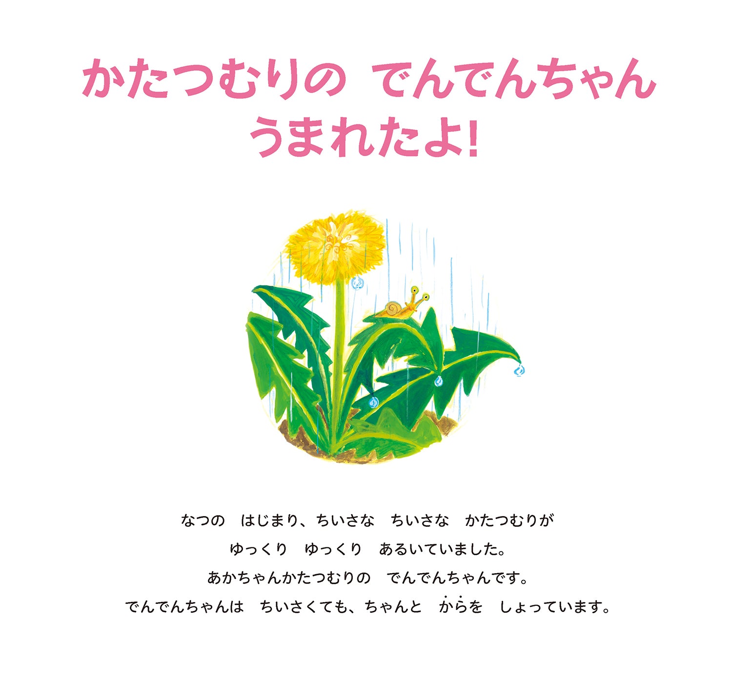 雨あがりの葉陰から始まる、かたつむり・でんでんちゃんのゆったりした旅を描く自然絵本。ゆったりとした語り口で生態や冬眠の話なども盛り込み、虫が苦手な子にも好評。季節の移ろいや命の営みをやさしく伝える一冊です。
