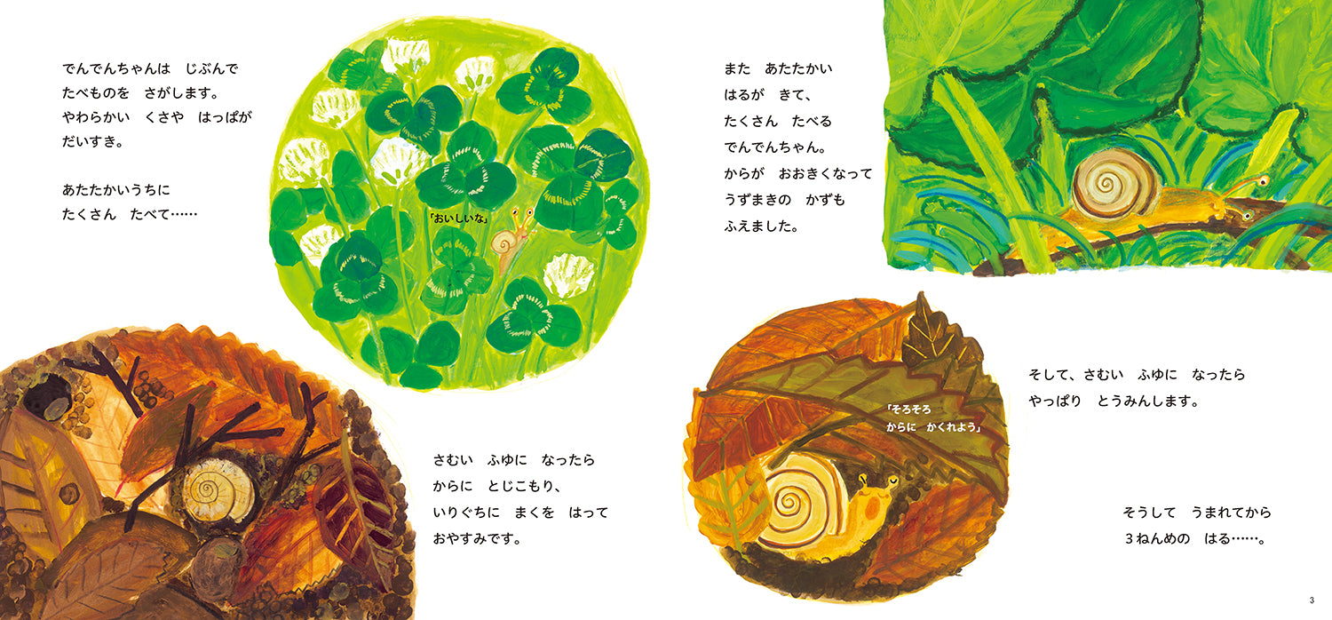 「でんでんちゃんはうまれたばかりでも、自分で食べ物を探します。」